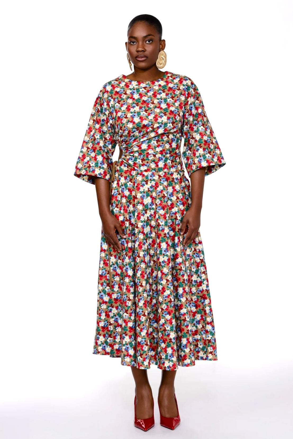 Mid length sleeves , pockets and a flared hem finishes of the look.