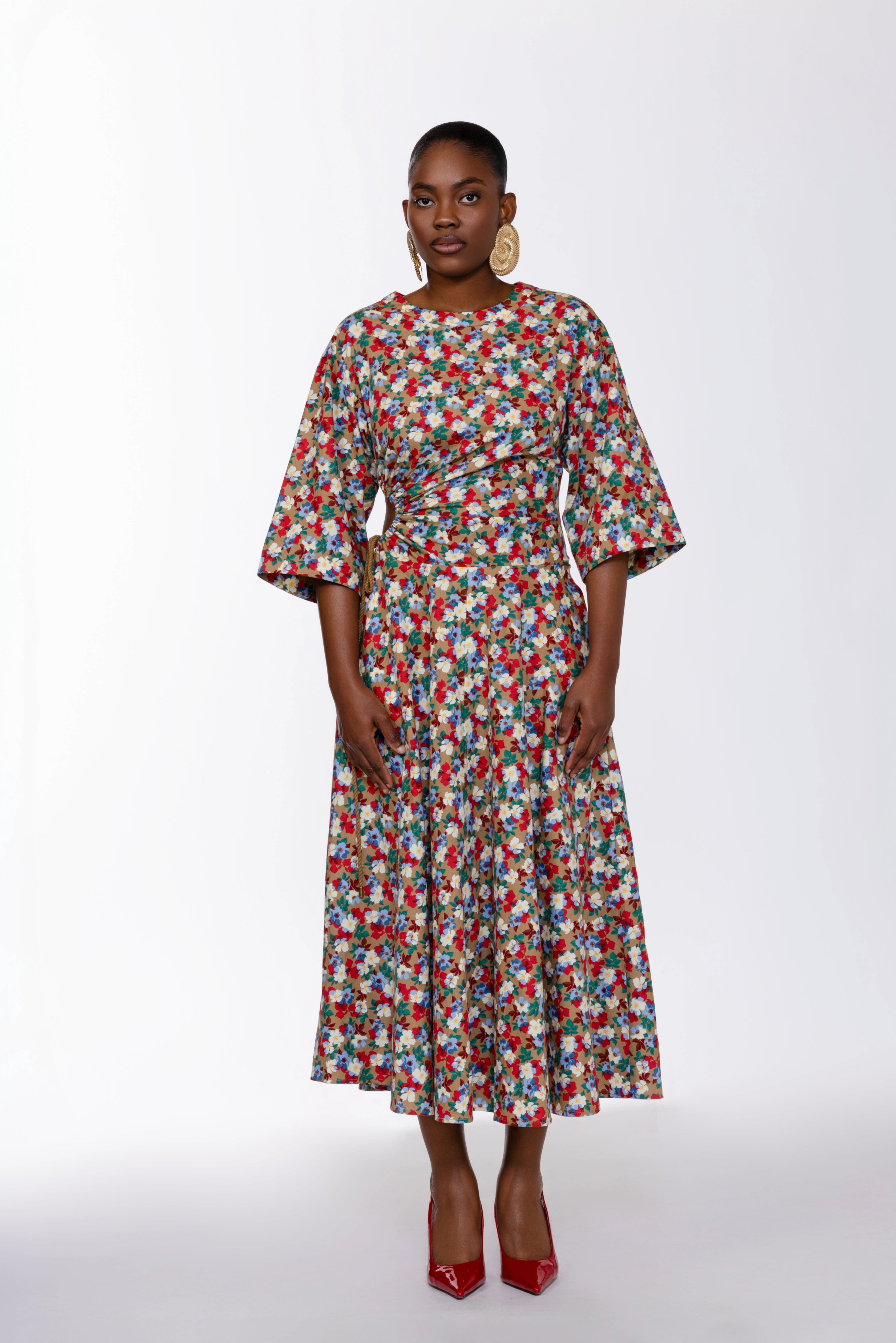 Mid length sleeves , pockets and a flared hem finishes of the look.