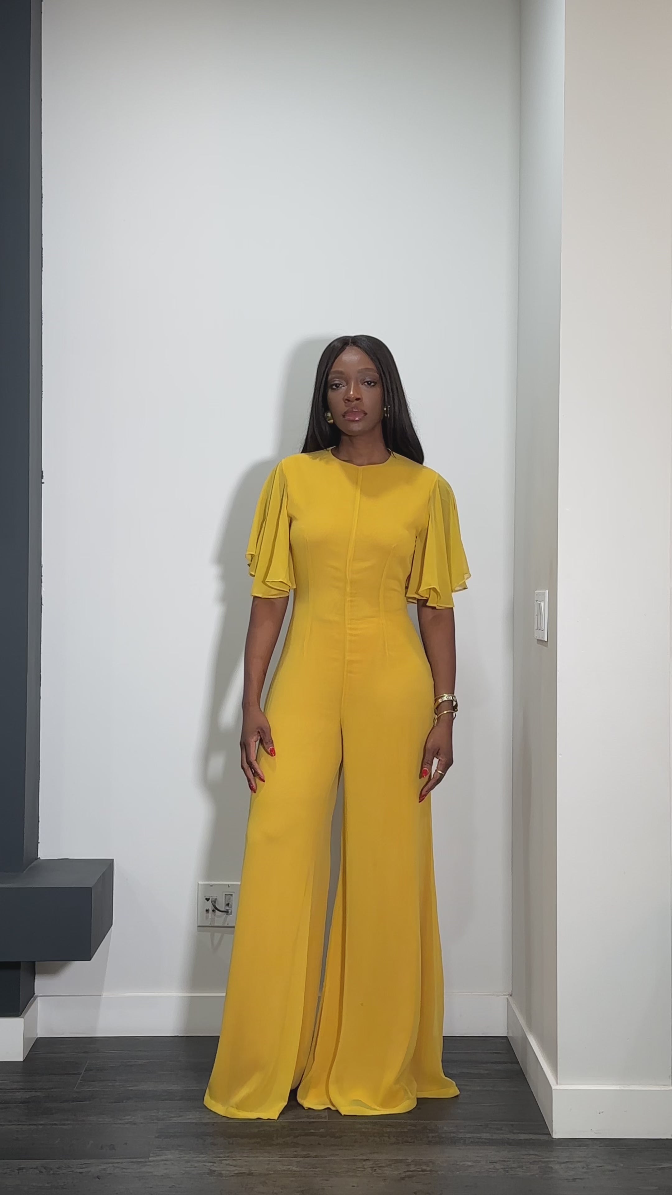 The Eli jumpsuit is crafted from a soft buttery chiffon fabric. A beautiful triangular cut out to the back and flare sleeve finish off the details of this must have number!
