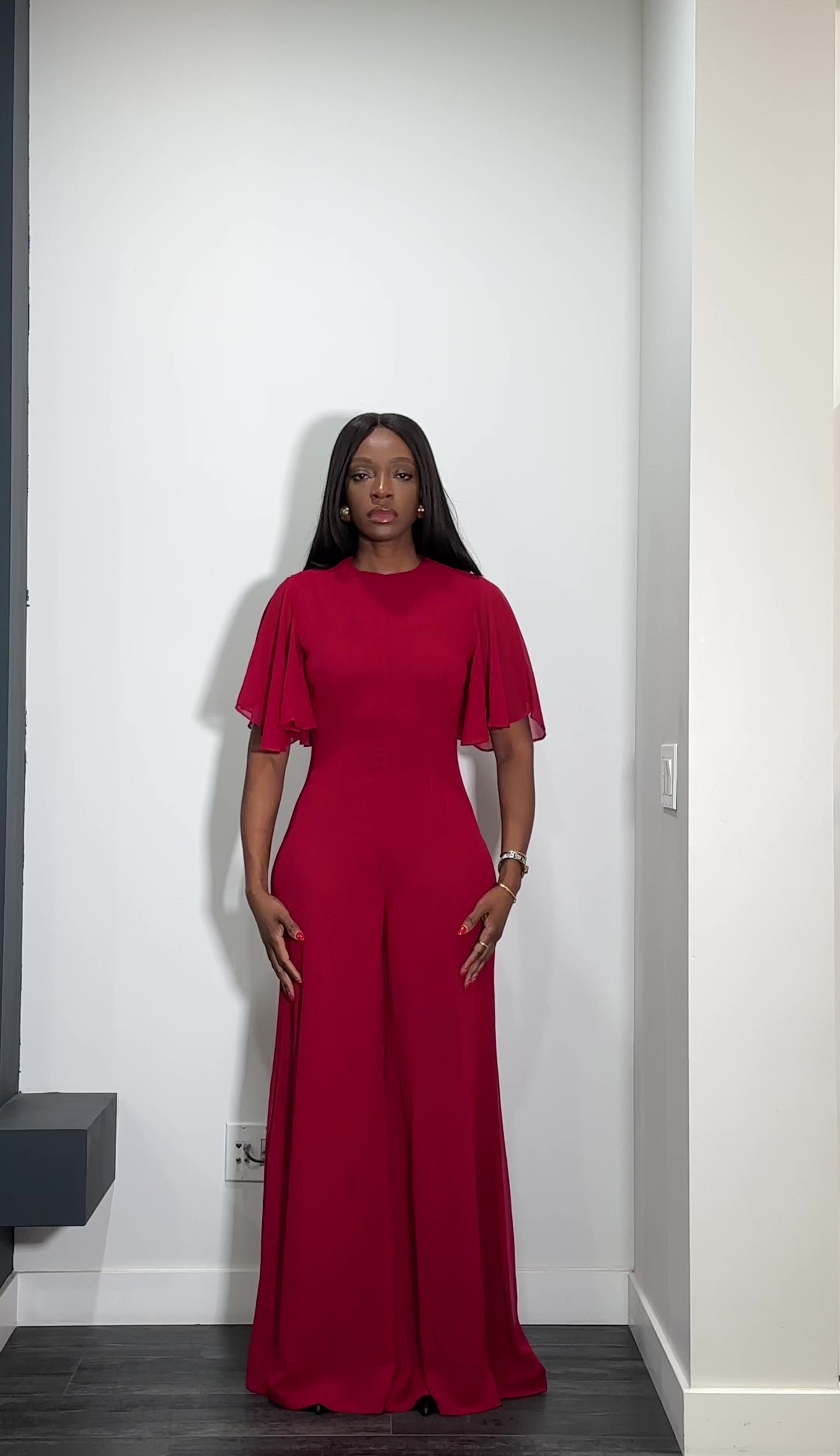 The Eli jumpsuit is crafted from a soft buttery chiffon fabric. A beautiful triangular cut out to the back and flare sleeve finish off the details of this must have number.